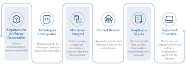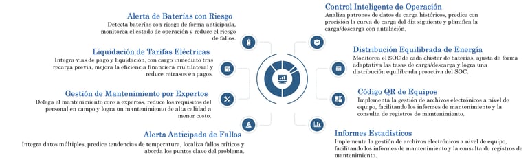 Con ocho funciones clave, establecemos una gestión inteligente completa. Desde la alerta temprana hasta el mantenimiento, desde el control hasta la liquidación, aseguramos un funcionamiento seguro, eficiente y económico.