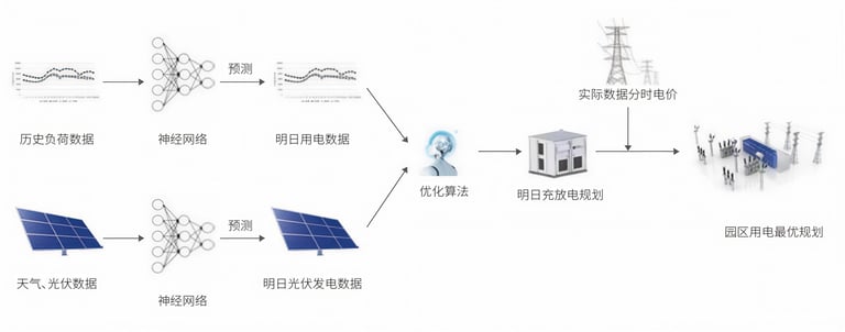 依托历史负荷数据与天气、光伏数据,通过神经网络精准预测明日用电与光伏发电曲线;结合实时分时电价,经优化算法生成最优充放电策略,最终实现园区用电的高效规划与成本优化,让储能收益最大化。