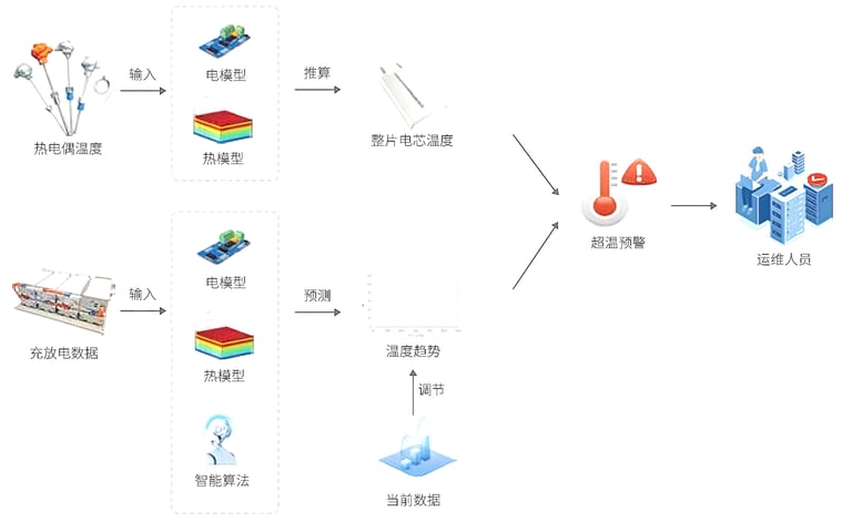 通过电模型 + 热模型双引擎驱动,结合热电偶温度与充放电数据,精准推算整片电芯温度,预测温度变化趋势。依托智能算法对当前数据进行动态调节,一旦触发超温阈值,立即向运维人员推送预警信息,实现从被动抢修到主动预防的升级,从源头规避热失控风险,保障储能系统安全稳定运行。